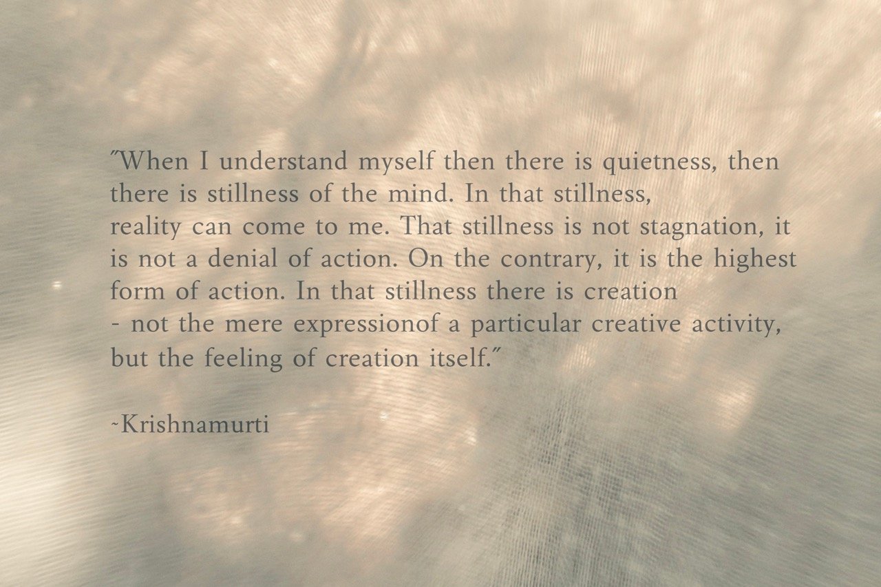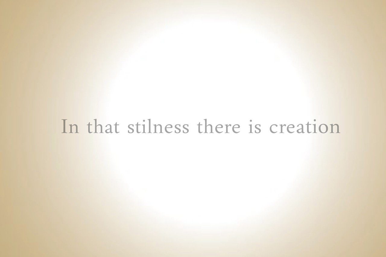 een taal die zachtjes en diep in ieder van ons vibreert. Vanuit de stilte, de oneindige ruimte binnen in, creëren we. Ruimte is stilte die een diepere laag in zichzelf erkent en hoewel de innerlijke ruimte geen vorm heeft, is ze intens levend. De lege ruimte is het leven in zijn volheid,
